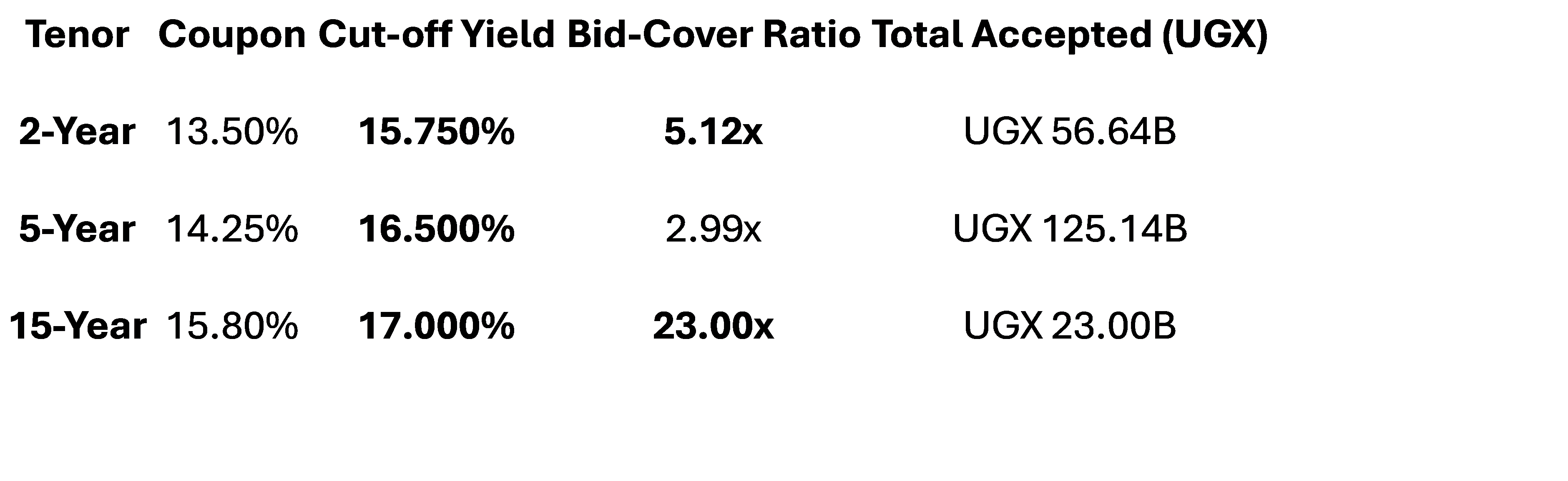 The auction offered 2Y, 5Y, and 15Y maturities. Demand was strongest for the 15Y bond, but BoU only accepted UGX 23B despite a record 23x bid-cover ratio, indicating tight issuance control. See a further review of the auction results here.