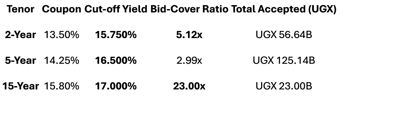 💰 15-Year bond had massive oversubscription but BoU issued only UGX 23B, likely to manage duration risk and anchor yields.
