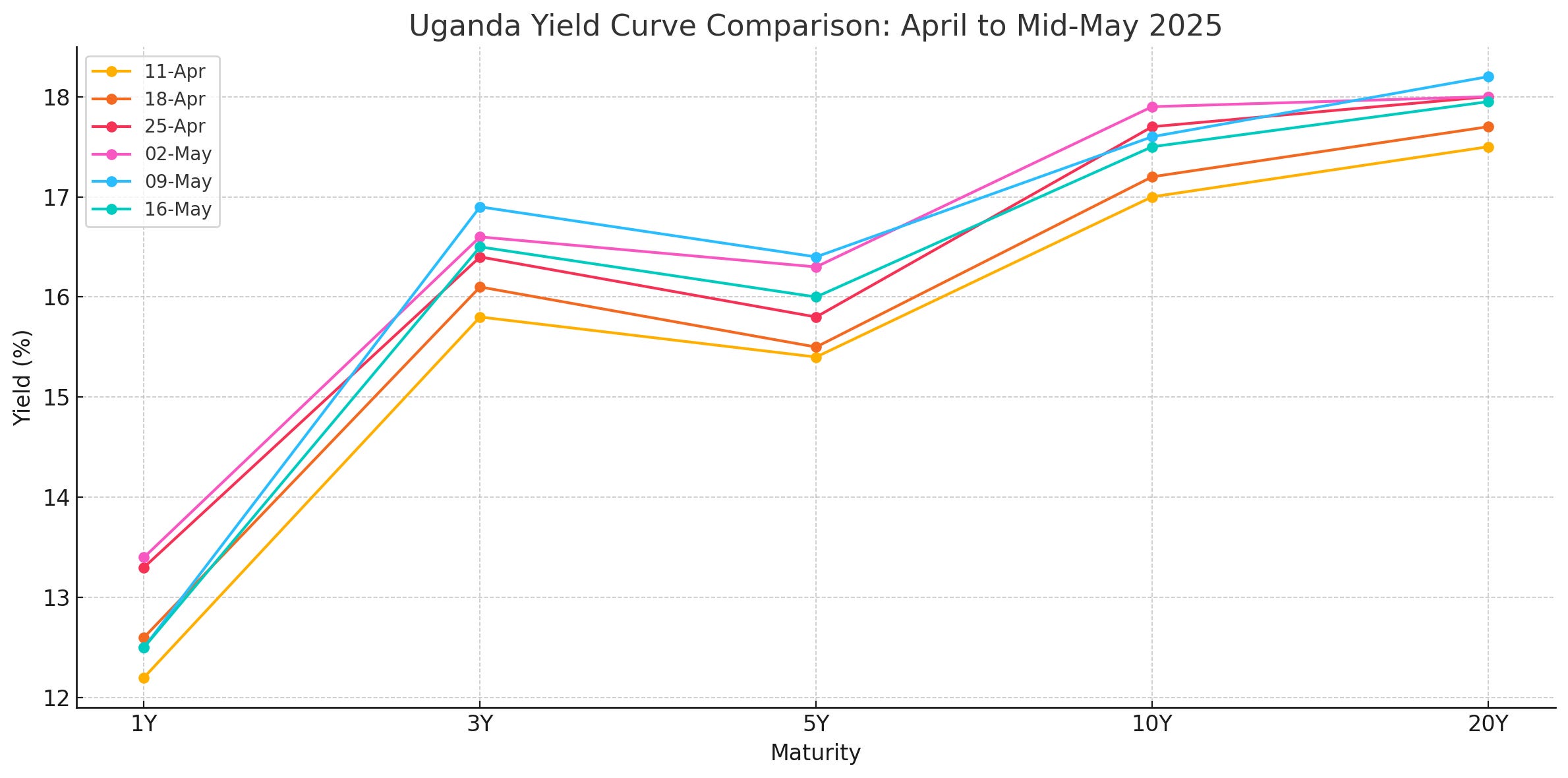 Uganda's yield curve continued to steepen through April but began to stabilize and compress at the long end in mid-May.