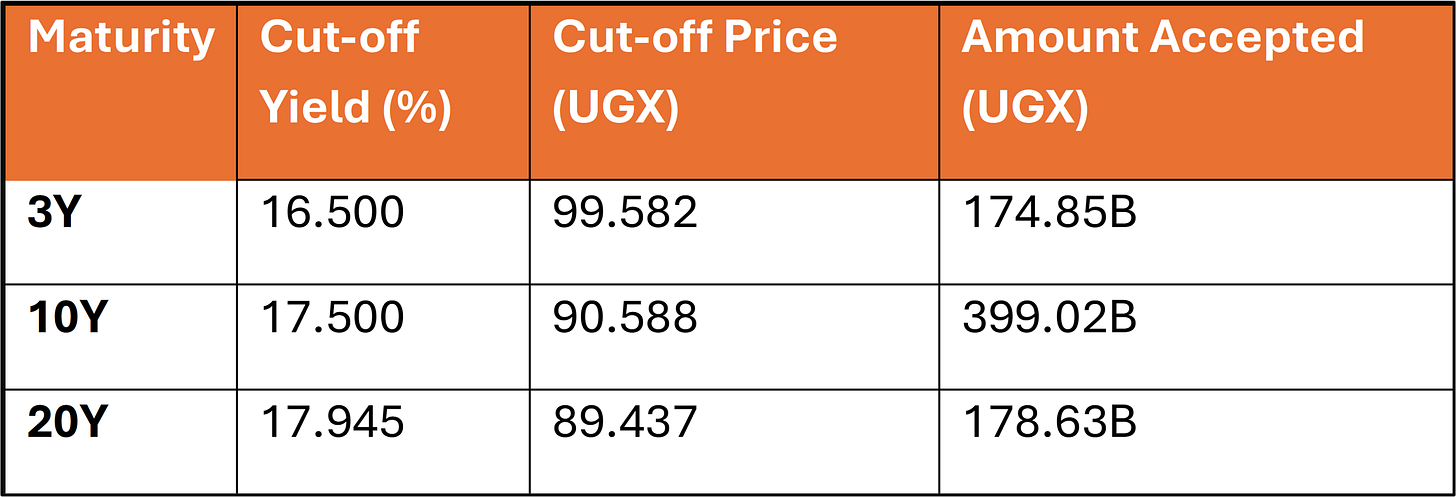The primary market auction on 14 May saw Bank of Uganda reopen 3Y, 10Y, and 20Y benchmark bonds, receiving over UGX 1.7 trillion in bids and accepting UGX 757 billion, showing aggressive market participation across tenors.