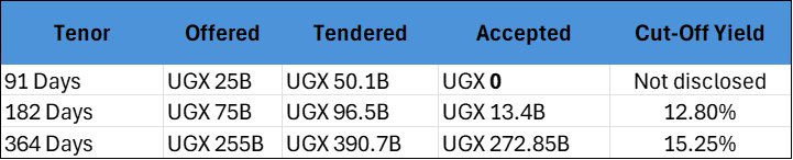 This week’s Treasury Bill auction, Auction No. 1203, by the Bank of Uganda (BoU) left us with some surprises—most notably, a complete rejection of all 91-day bids!