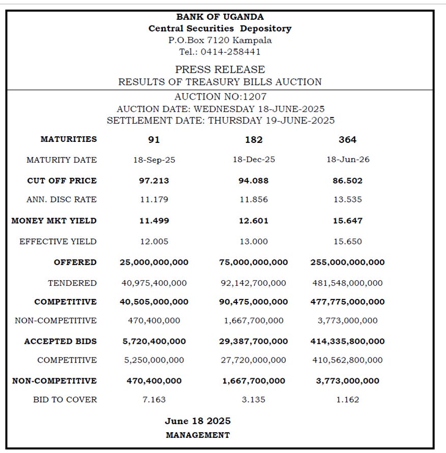 The Bank of Uganda’s latest Treasury Bill auction (No. 1207) held on 18 June 2025 continued a clear trend: rising yields, strong investor appetite, and a cautious central bank that’s still managing short-term costs.