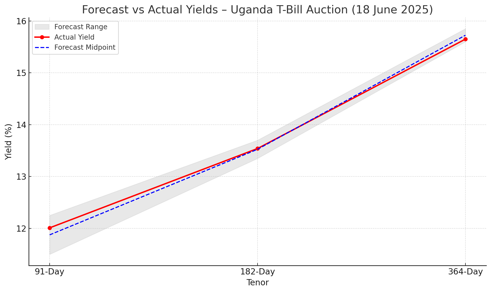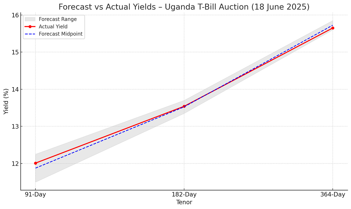 The 91-day yield jumped significantly from the secondary market (as low as 10.76%) to an auction-level effective yield of 12.01%, suggesting BoU is now allowing more flexibility after several tight auctions.